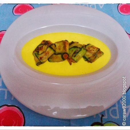 Colocamos dos laminas del calabacín en forma de cruz y en el medio ponemos nuestro relleno de tomate y cebolla y lo cerramos , vamos repitiendo esta operación hasta tener todo el calabacín relleno, lo vamos haciendo a la plancha con mucho cuidado para que no se nos deshagan los raviolis .