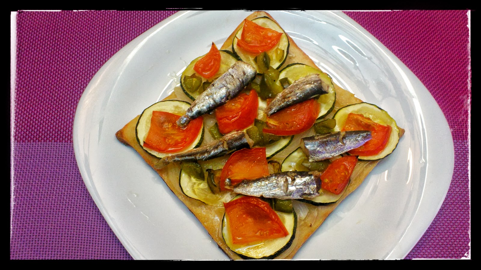 Estiramos la masa y cortamos con un cuchillo en 4 o 5 partes según comensales , las ponemos en una bandeja de horno con papel de horno y empezamos a poner nuestros ingredientes mientras precalentamos el horno a 195 grados , primero pondremos la cebolla en juliana por todas las masas , cortaremos el calabacín en rodajas y se las añadiremos , hacemos lo mismo con los tomates en medias rodajas y por ultimo añadiremos las sardinas y le echaremos un buen chorrito de aceite y sal para que se junten todos los jugos , metemos en el horno y vamos vigilando para que la masa no se dore demasiado , sacaremos y presentaremos .