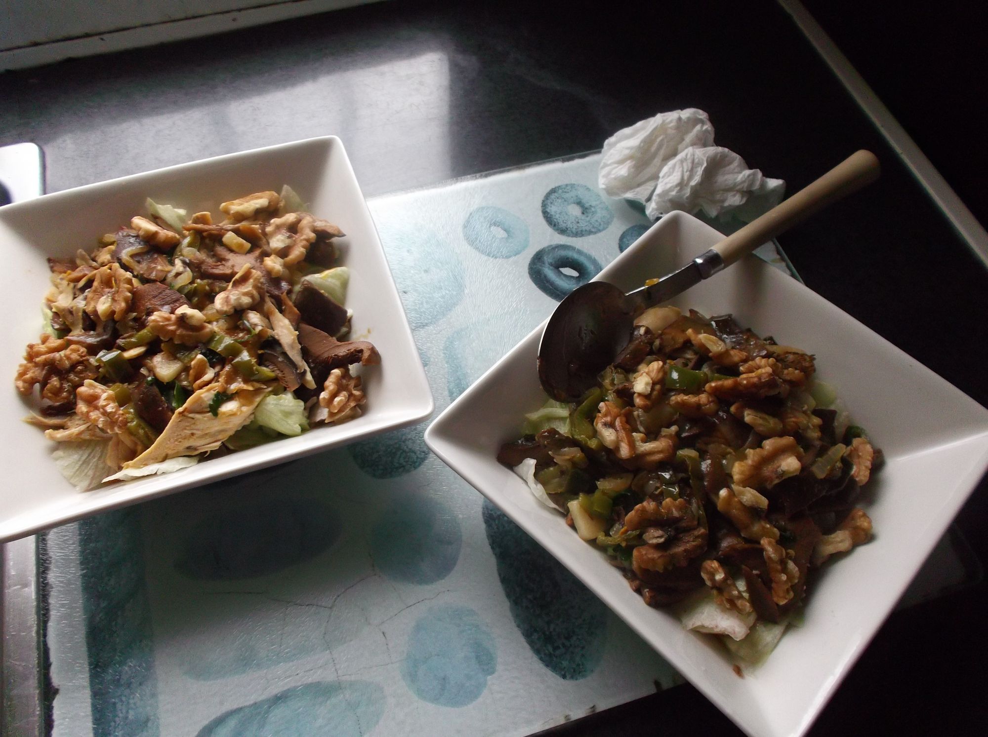 Le damos unas vueltas para mezclar la lechuga con el pollo y las verduras obteniendo una ensalada templada.