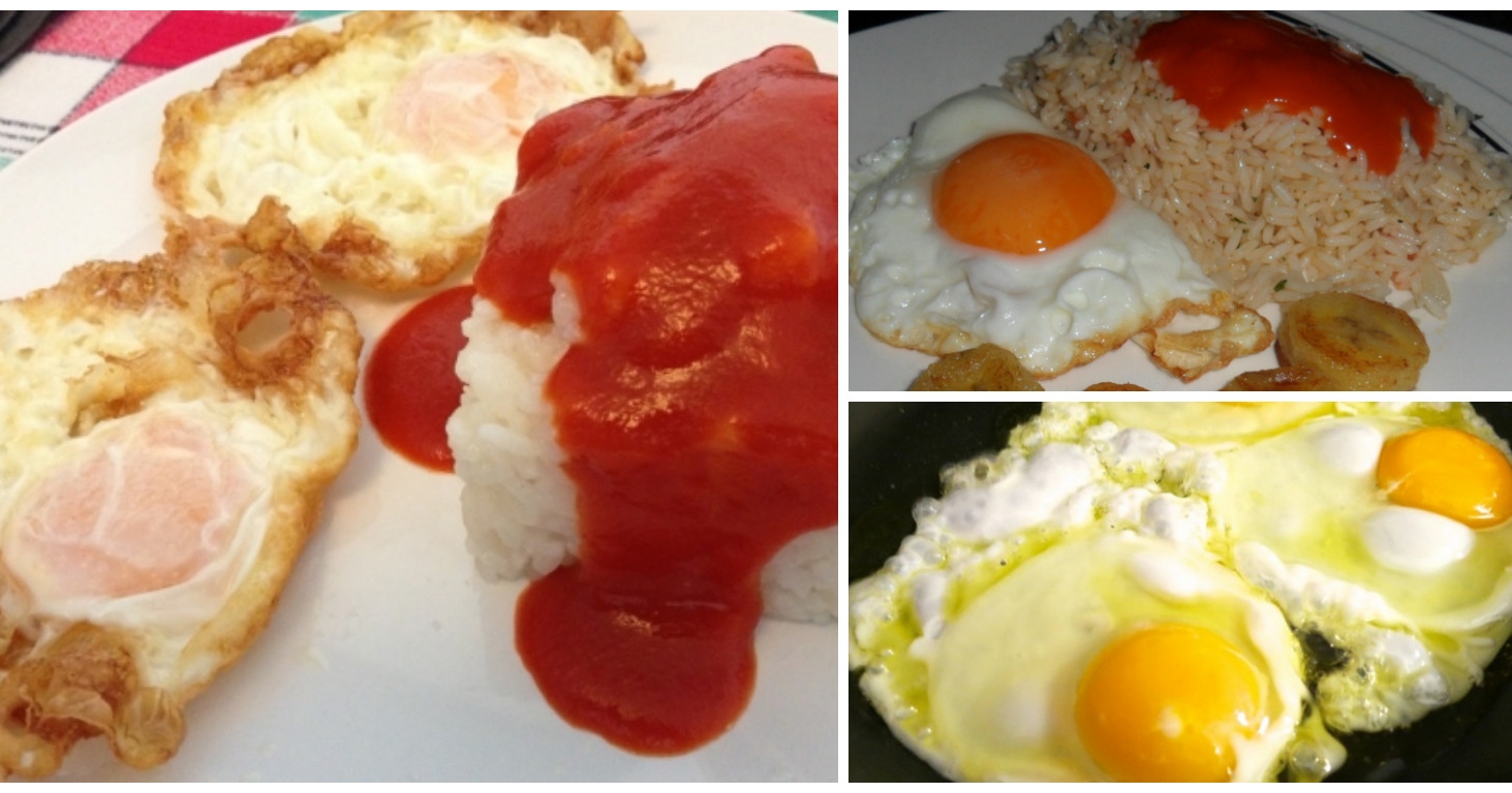 Servir en un plato el arroz (se le puede dar forma con un molde), echar uno de los huevos encima del arroz o al lado y las salchichas y el plátano a ambos lados.