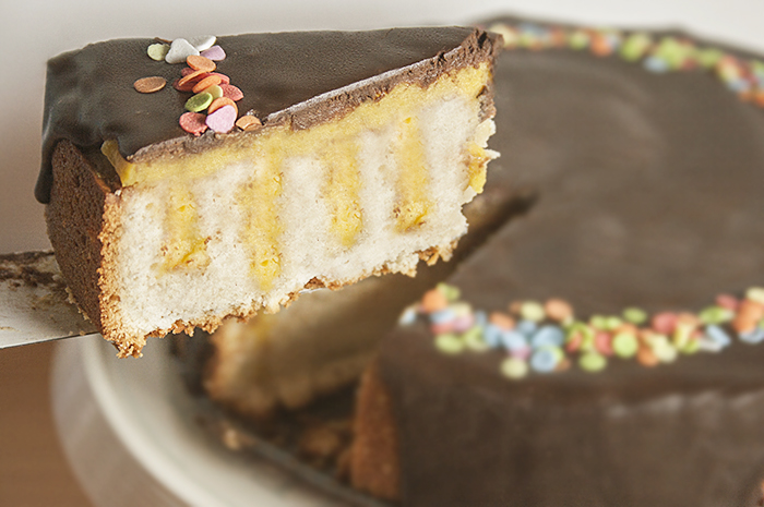 La receta de bizcocho que escogí es de miga densa, por lo que con la crema se queda con un sabor y textura muy buenos. Os recomiendo hacer cuantos más agujeros mejor, muchos más que yo, porque la parte de la crema es lo mejor de la tarta y te quedas con ganas de más.