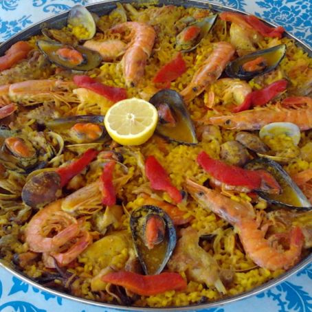 Después de apagar el fuego es conveniente dejar reposar 5 minutos antes de servir y decorar con rodajas de limón y pimientos morrones. Si se quiere también se puede reservar previamente langostinos y cigalas para la decoración del mismo modo que se hizo con los mejillones.