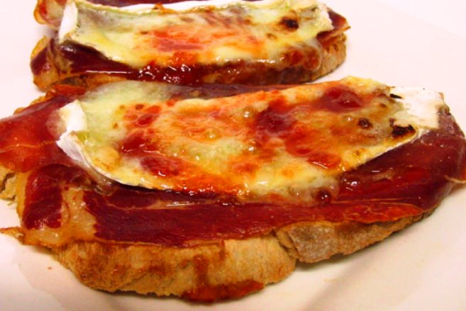 Ponemos sobre el pan caliente el jamón, encima de este, el queso cortado en rodajas finas para que se funda, y por ultimo vertemos la salsa de frambuesa.