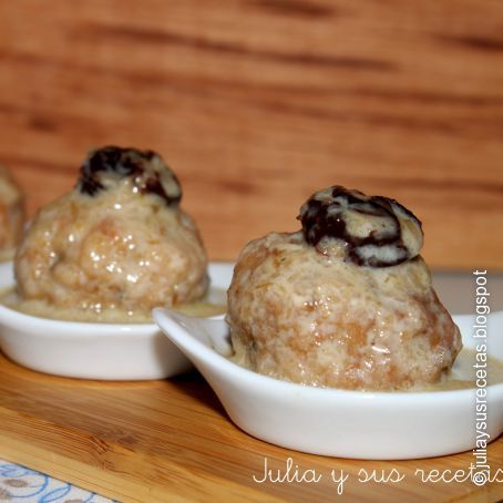 Ponemos las albóndigas en una cazuela y les añadimos la cebolla triturada, junto con el vino y las uvas pasas.