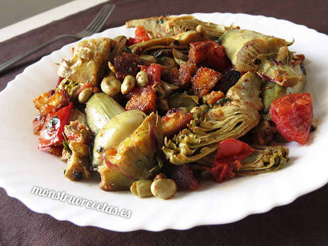 Volvemos a añadir una cucharada de aceite de oliva en la misma sartén y calentamos a fuego lento. Escurrimos las habas y las alcachofas y las salteamos en la sartén. Cuando comiencen a ponerse doradas, incorporamos las migas, las hierbabuena picada, los tomates y una pizca de comino en polvo. Movemos unos instantes y servimos.