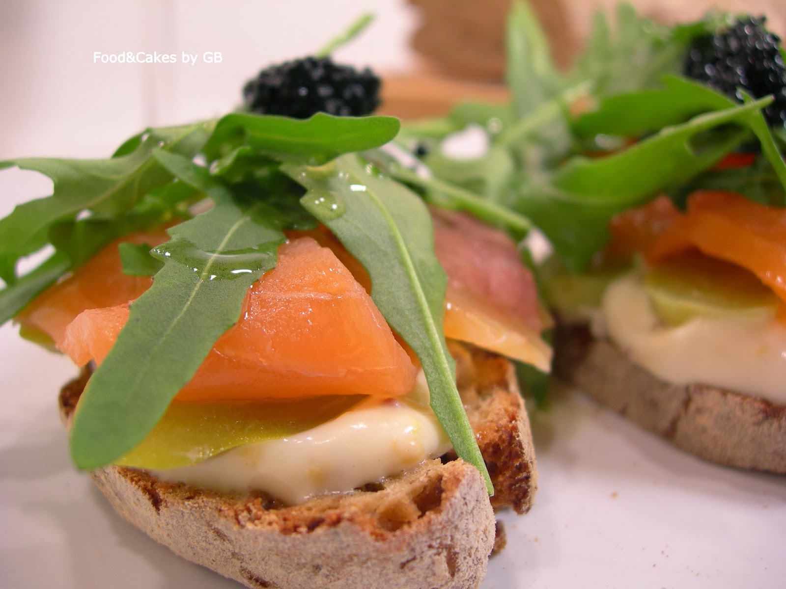 Crostini de pan rústico con salmón ahumado, pepinillos y rúcula.