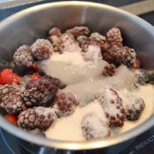 Comenzamos poniendo en un cazo las frutas del bosque con el azúcar y dos cucharadas de agua. Con que lo dejemos cocer 5 ó 10 mn es suficiente.