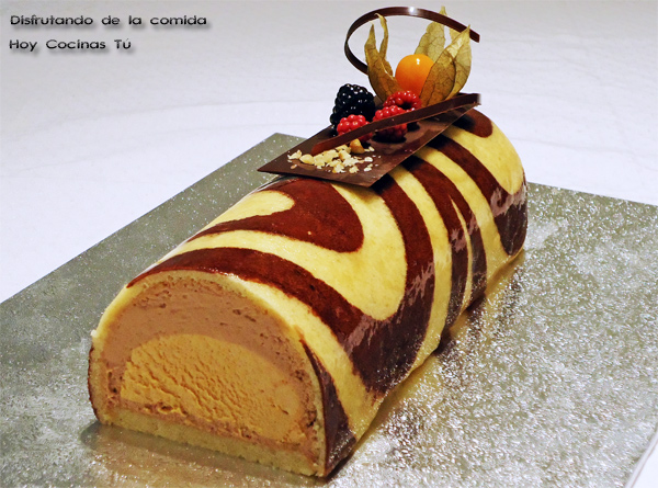 Preparamos el glaseado neutro, hacemos un almíbar con el agua y el azúcar, retiramos del fuego y añadimos las hojas de gelatina (previamente hidratadas), removemos bien y reservamos. Sacamos el tronco del congelador, desmoldamos y lo bañamos con el glaseado neutro, metemos en el frigorífico hasta que cuaje el glaseado.