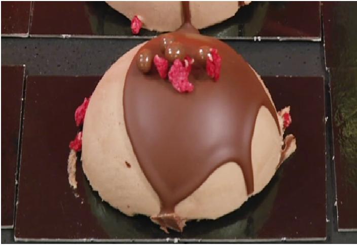 • Derretir chocolate con mantequilla, remover, añadir praliné y los kikos y verter sobre una placa forrada con papel de horno. Dejar enfriar ligeramente y recortar bases con la ayuda de un aro.