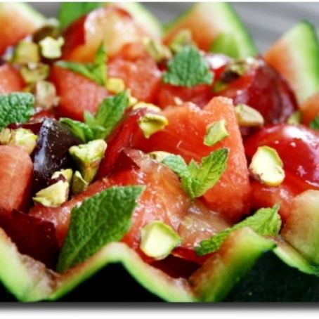 Macedonia de sandía, ciruelas, pistachos y menta. Descubre nuestra receta.