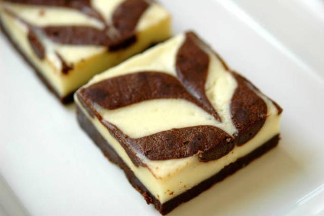 Con un cuchillo hacemos un efecto para que quede mármolado, sin pasarse para que se mezclen las dos capas. Ponemos en el horno previamente precalentado, con calor arriba y abajo, durante 45 minutos a 170 grados. Dejar enfriar dentro del molde sobre una rejilla. Cortar porciones de 4x4 aproximadamente.