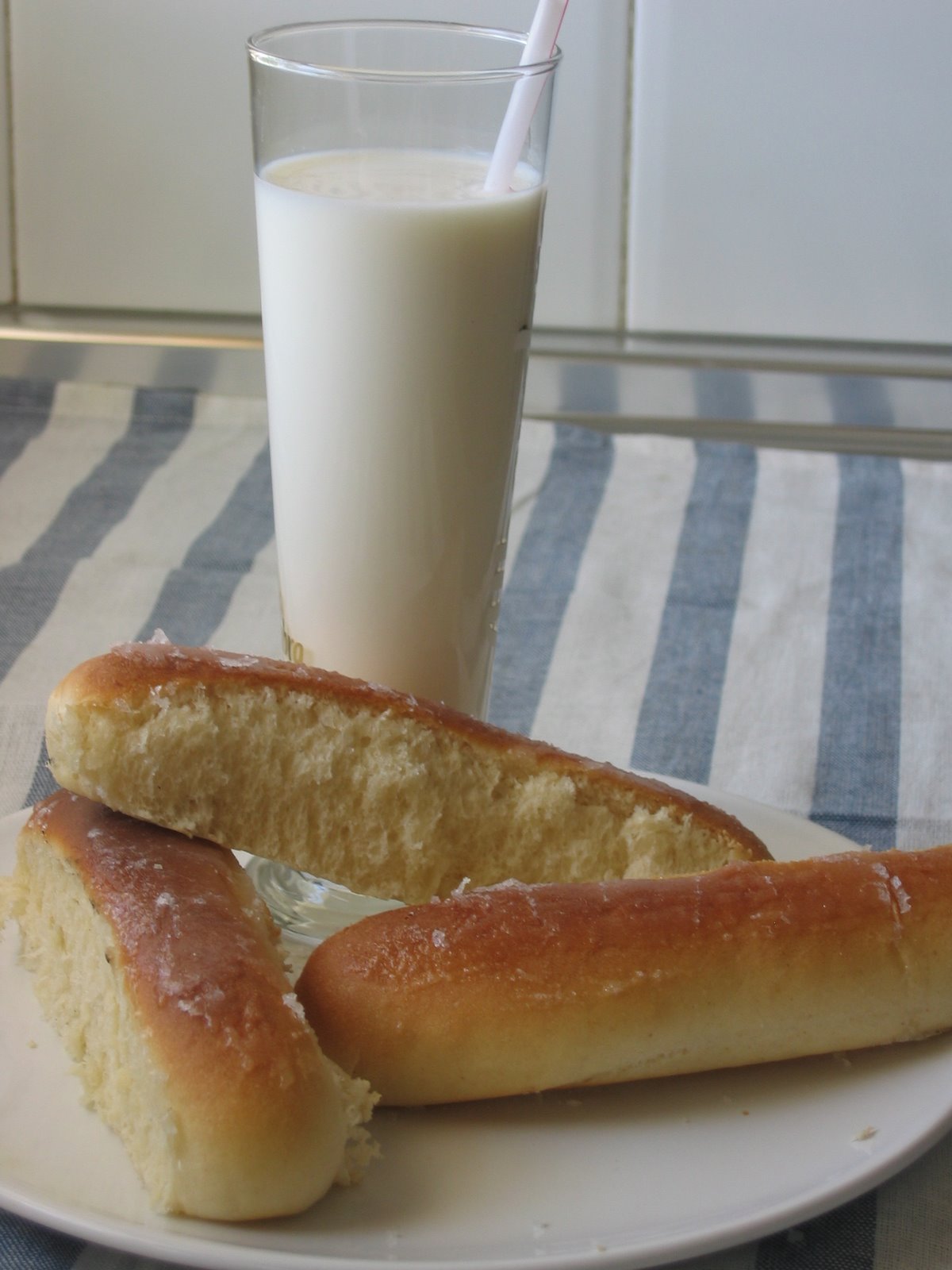 Una vez la masa haya doblado su volumen coge porciones de 25 gr y forma barritas de unos 25cm, deja reposar encima de la bandeja, -esta la tienes que tener preparada con papel de hornear-, hasta que tripliquen su volumen.