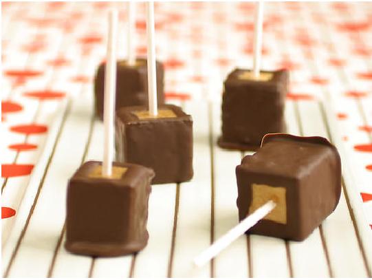 Saca la tarta del molde levantando el papel de aluminio. Transfiere la tarta a una tabla para cortar. Corta la tarta en cuadraditos e inserta en cada uno de ellos un palito de madera. Mete los pops en el congelador por 1 hora. Derrite el chocolate con la mantequilla al baño maría o al microondas.
