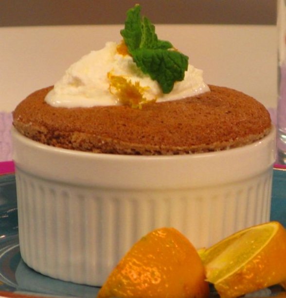 Sirve el suflé de naranja con el chocolate por encima. Espolvorea con azúcar glas.