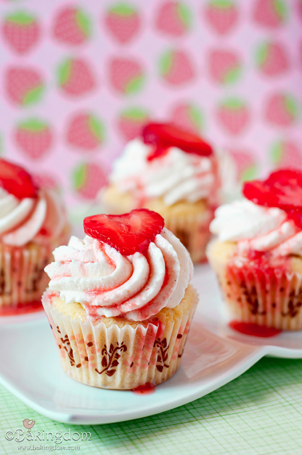 Precalentar el horno a 160°C (325°F). Preparar el molde para cupcakes colocando las cápsulas de papel. Reservar. Combinar en un recipiente la harina, la levadura y la sal. Reservar. Batir en otro bol la mantequilla y añadir el azúcar. Mezclar bien. Añadir los huevos, de uno en uno, y mezclar. Añadir el chocolate blanco derretido y la vainilla. Mezclar todo muy bien. Incorporar a esta mezcla 1/3 de la mezcla de harina y mezclar bien. Añadir la mitad de la leche, mezclando hasta que quede bien combinado. Añadir el resto de la harina y la leche. Mezclar solo lo suficiente, pero no demasiado. Colocar 2 cucharadas de la mezcla en cada cápsula de papel para cupcakes. Hornear durante 20-22 minutos, hasta que el centro de los cupcakes estén firmes. Dejar enfriar. Hacer un hueco en cada cupcake y rellenar de helado de fresa. Decorar con frosting.