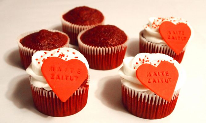 Cuando los cupcakes horneados ya estén completamente fríos los decoramos por encima con la crema de queso. Colocamos la crema en una manga pastelera con una boquilla ancha. Presionando, apoyamos la boquilla en el centro del cupcake y dibujamos una espiral hacia afuera. Lo rematamos con un corazón de fondant. Por último, espolvoreamos unos sprinkles rojos por encima de la crema de queso.
