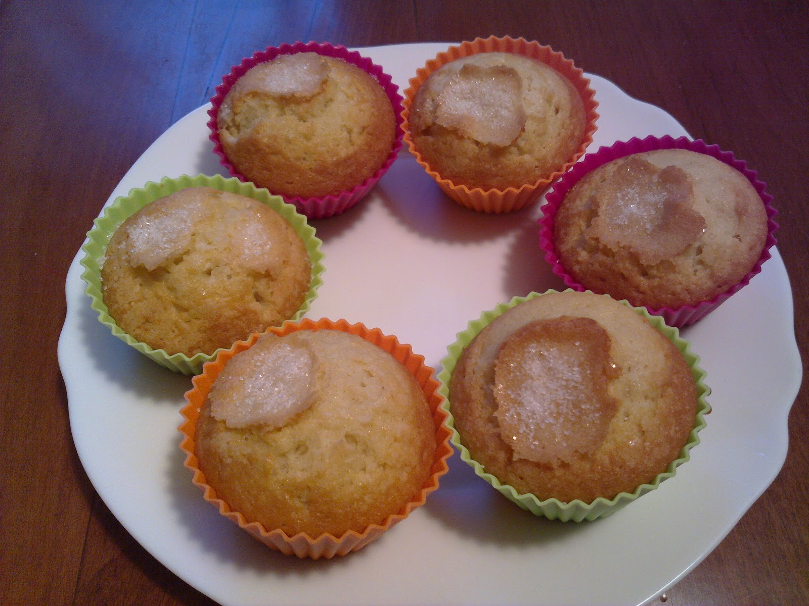Se pone el aceite al fuego y se frie la cáscara de una naranja, y se deja que se enfríe antes de hacer la masa de las magdalenas. Se baten las yemas con el azúcar hasta que queda la masa esponjosa, se añade la raspadura y el zumo de limón, y cuando está integrado, se añade el aceite y por último la harina mezclada con la levadura. Una vez que se incorpora la harina es aconsejable batir sólo lo necesaior para hacer la masa homogénea, incluso no importa que quede algún grumito, porque el horno desaparecerá. Se baten las claras a punto de nieve y se incorporan a la masa, entremetiéndola con couidado de que no se bajen demasiado. Se pone la masa en las cápsulas de papel se espolvorean con un poco de azúcar y se hornean con el horno no muy fuerte, a unos 170°. La cocción suele durar alrededor de media ahora. Cuando están doradas, se sacan del horno y se dejan enfriar. Estas magdalenas son muy jugosas, y quedan mejor en cápsulas grandes. Para evitar una tercera hornada, hice unas cuantas en moldecitos de panettone, y quedaron muchísimo más jugosas.