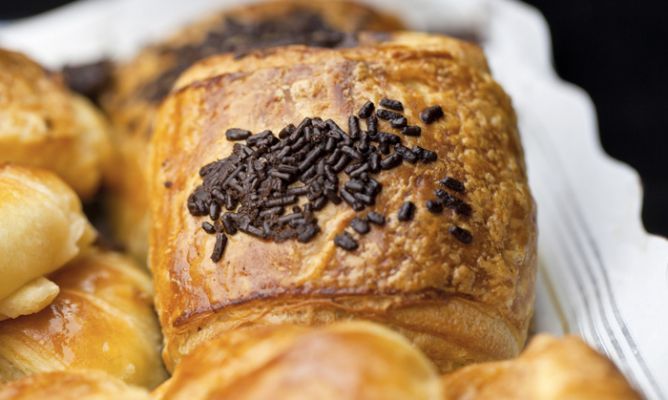 En un cuenco grande mezclamos la harina con la sal y el azúcar. Formamos un volcán. Templamos la leche hasta unos 30° C (no caliente), yo lo hago en el microondas. Disolvemos la levadura en la leche templada, añadimos con la esencia de vainilla a la mezcla de la harina. Amasamos. A medio amasar incorporamos la margarina y seguimos amasando hasta formar una masa lisa y sin grumos. Si después de amasar suficientemente queda pegajosa echamos un poco de harina. Envolvemos en película de cocina e introducimos en el frigorífico. Yo amaso por la noche y sigo al día siguiente. Cuanto más repose más fácil será el proceso de hojaldrado. Estiramos la masa en una superficie enharinada (con las masas fermentadas, a diferencia del hojaldre, no pasa nada por enharinarla en exceso, siempre que la masa no quede dura), formando un rectángulo de 5 mm de espesor. Trabajamos la mantequilla para hojaldrar hasta que quede blanda y sin pegotes. Extendemos la mantequilla 2/3 de la superficie desde lado largo y doblamos en 3 partes, de tal forma que la parte que no tenía mantequilla quede en el centro. Volvemos a doblar en 3 partes (vuelta sencilla) por el lado largo (el que antes era corto), envolvemos en película de cocina y llevamos al frigorífico una hora (o más). Damos dos vueltas sencillas más con reposos de 20-30 min entre cada una. Si la masa está demasiado fría, la dejaremos templar un poco para que no se formen grumos de harina y no se quiebre. Si la masa está demasiado templada la introducimos en el frigorífico hasta que tenga la temperatura adecuada y cierta consistencia. Si está caliente se derramaría la mantequilla. Retiramos la masa del frigorífico, la estiramos hasta un grosor aproximado de 5 mm. Cortamos en rectángulos, enrollamos poniendo un trozo de chocolate en el centro y depositamos sobre una bandeja cubierta con papel de hornear con el corte hacia abajo. Introducimos en el horno (apagado o a unos 25-30°C) y dejamos fermentar hasta que haya doblado su volumen. Cuando haya doblado su volumen retiramos la bandeja del horno y lo precalentamos hasta una temperatura de unos 200° C. Pintamos la superficie de las napolitanas con huevo batido, espolvoreamos con almendras fileteadas e introducimos en el horno (ya caliente) hasta que tenga un ligero tono tostado. Nada +salir pintamos con jarabe hecho con 2partes de azúcar y 1de agua.