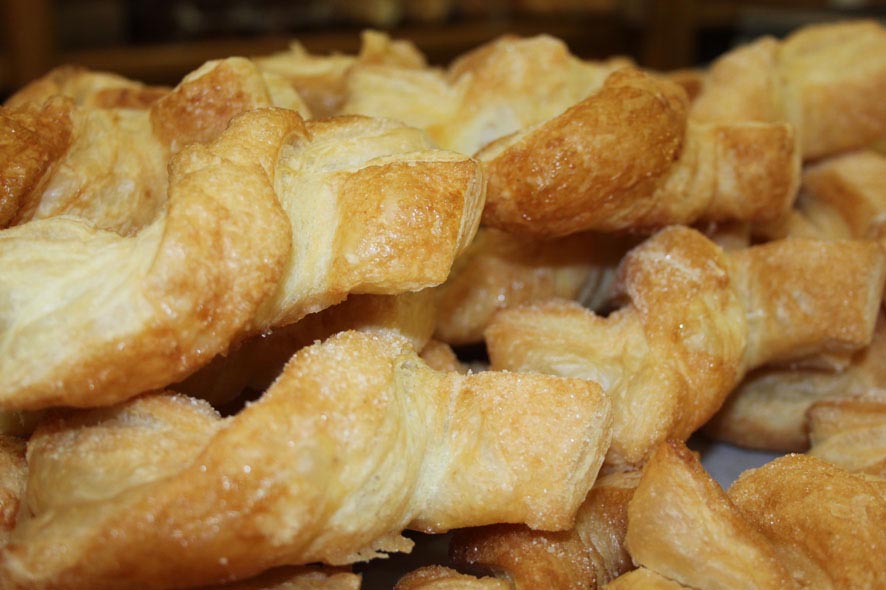 Cortar tiras y poner una sobre otra, yo pongo tres, pincelando con un poco de agua para que queden bien adheridas. Luego retorcer con cuidado. Colocar en bandejas de horno forradas con papel, pincelar con huevo batido, salpicar con azúcar granillo y cocer en el horno a 190°C durante 15-20 minutos aproximadamente. Depende de los hornos. Una vez hechos pasar a rejilla y dejar enfriar antes d consumir.