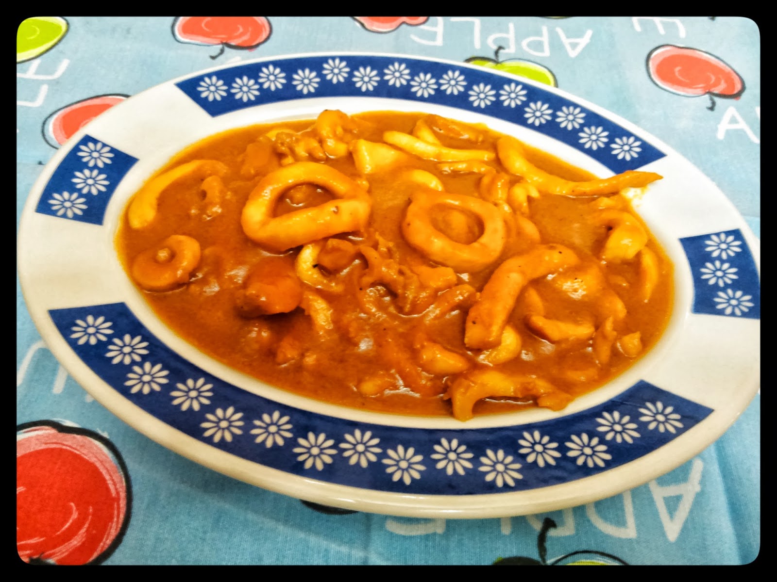 Cortamos las cebollas en trocitos muy pequeños y la ponemos a pochar en una cacerola con aceite de oliva, añadimos los ajos en laminas y dejamos hasta que comienza a ponerse transparente, agregamos el tomate triturado el azúcar y la misma cantidad de sal que de azúcar y dejamos cocinar durante 10 minutos, pasado el tiempo añadimos la pastilla de caldo, los calamares y un pellizco de pimienta y dejamos cocinar durante 15 minutos.