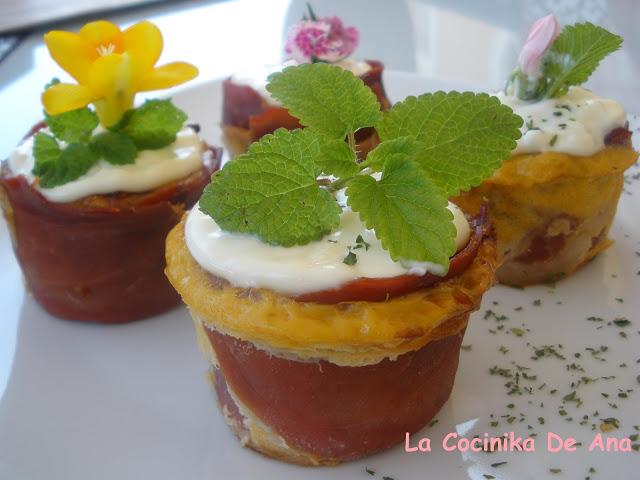 Con una pequeña cuchara rellena hasta el borde los moldes forrados con la loncha de jamón.