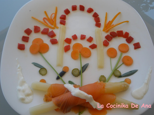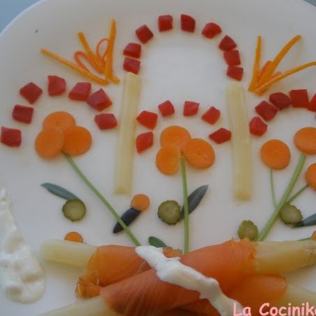 Los espárragos blancos, los he envuelto en laminas de salmón ahumado. He decorado el plato, con pimientos asados, pepinillos, aceitunas negras, zanahorias...