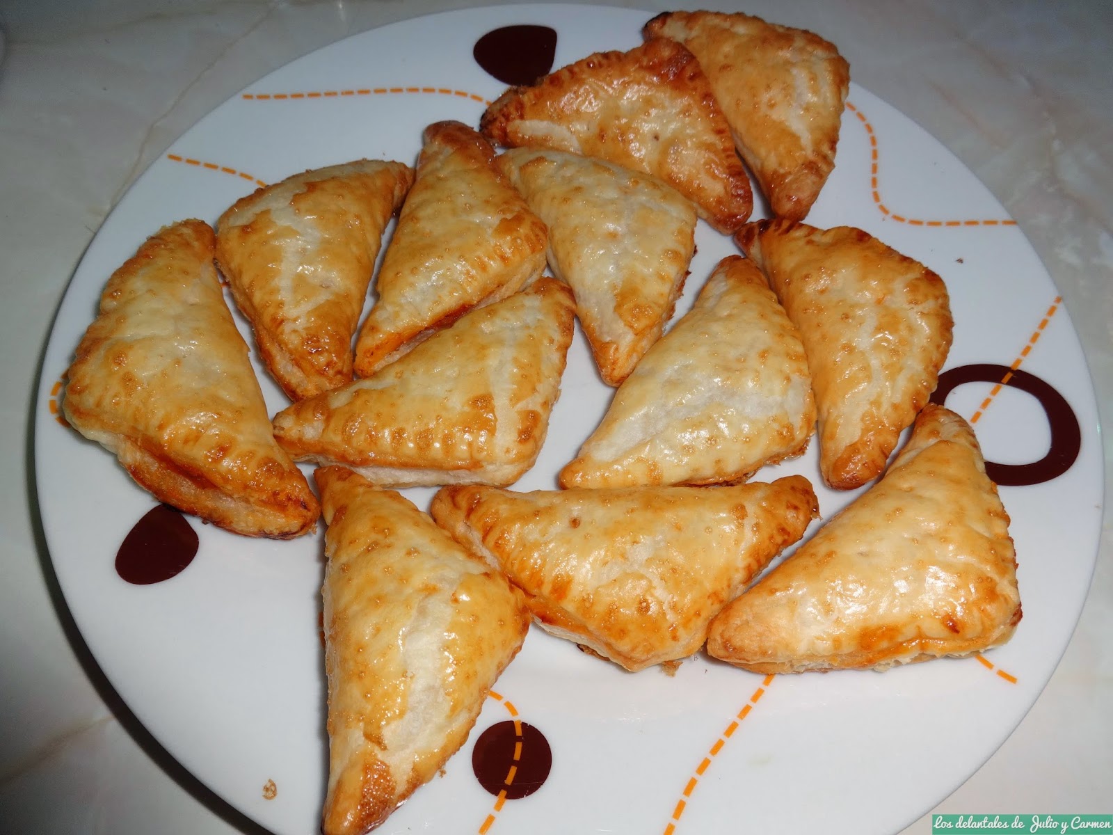 Pondremos una pequeña cantidad de atún en el centro del cuadrado y juntaremos dos de los picos contrarios, formando con ello un triangulo. Con un tenedor, aplastaremos los bordes de forma que quede sellado. Pincharemos con un palillo un par de veces la masa para que puedan respirar cuando lo metamos al horno.