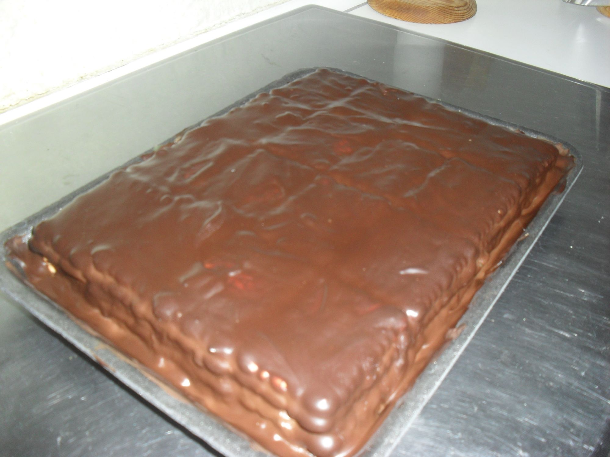 Poner una primera capa de galletas previamente mojadas en leche fría. Poner tantas galletas como porciones queremos tener en la tarta.