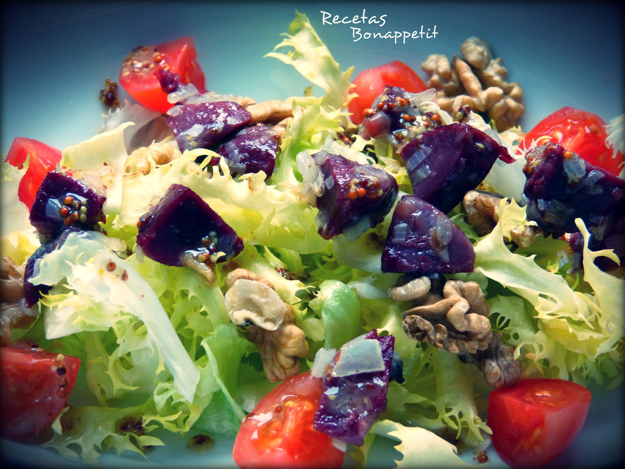 Toca emplatar. Colocamos de cama la escarola, alrededor los tomates cherry (cortados a la mitad o en cuartos) y las nueces encima de la escarola. Acabamos poniendo las mollejas y salseando todo el conjunto con unas cucharadas de la vinagreta. El resto de la vinagreta lo colocamos en una salsera.