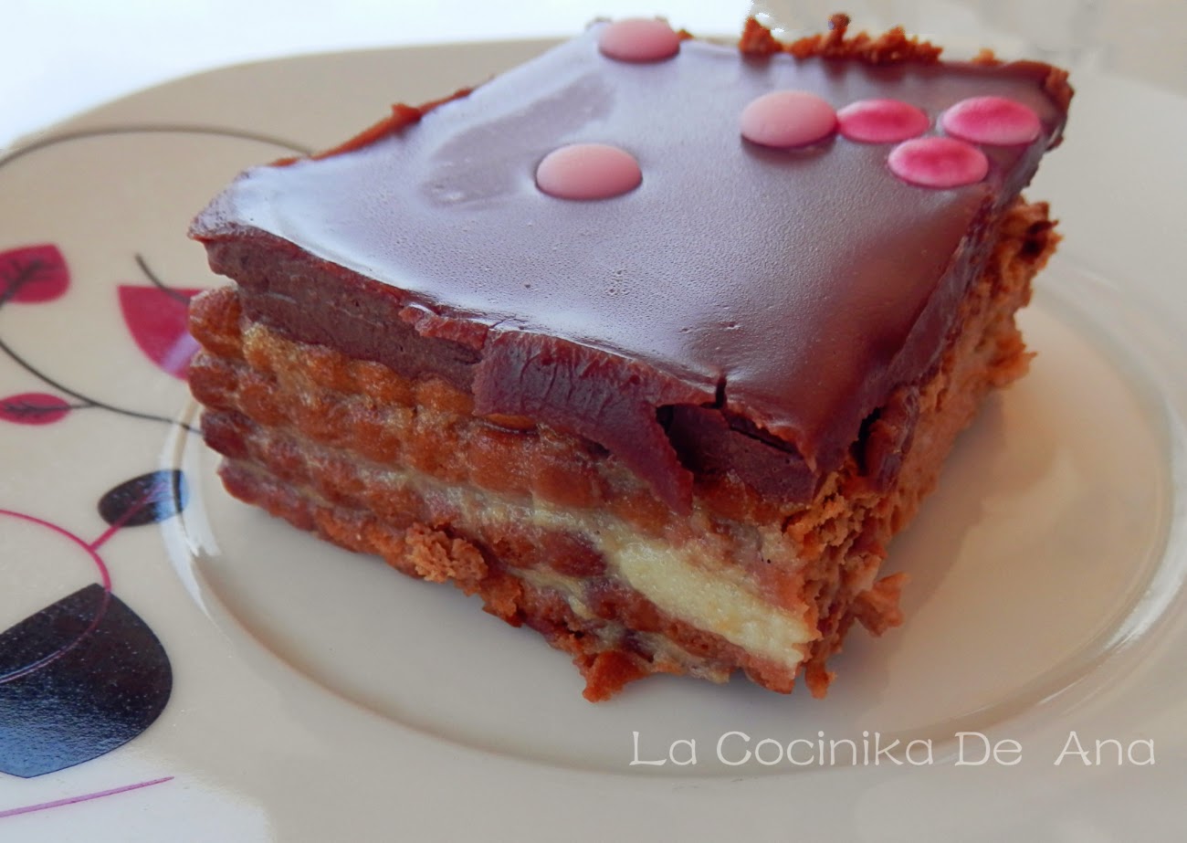 Mojaremos las galletas en la leche y en el molde elegido, pondremos una capa de ellas. Sobre las galletas pondremos una capa de natillas, otra capa de galletas regadas de nuevo con leche y otra capa de natillas Y otra capa más de galletas regadas en leche y como última capa la crema de chocolate.