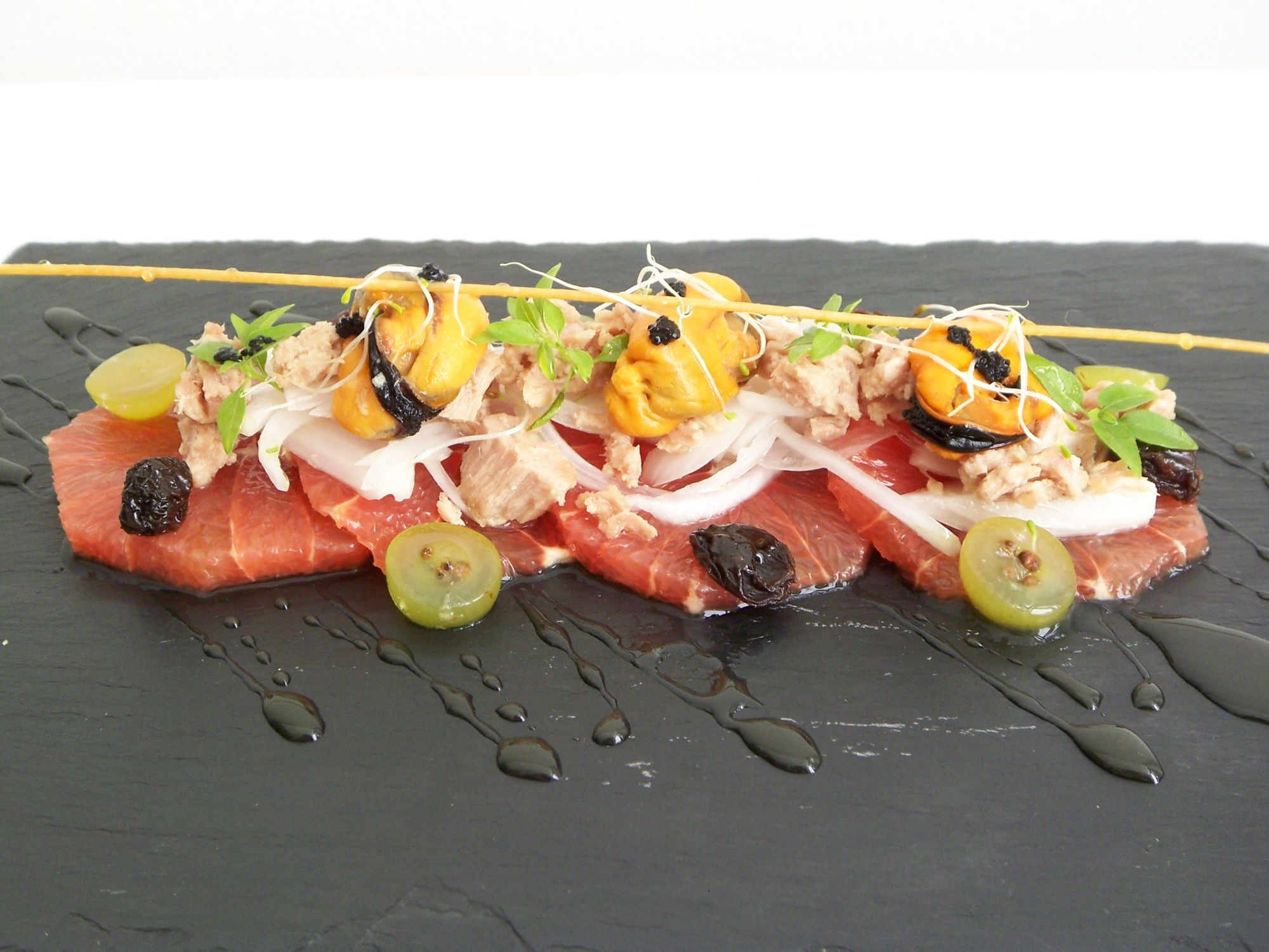 Cortamos el pomelo en rodajas finas, cortamos la cebolla en juliana fina y la uva en rodajitas.