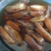 Partimos los dátiles y los hidratamos en el vino dulce de Málaga. Deben estar al menos una hora para que cojan bien el sabor.