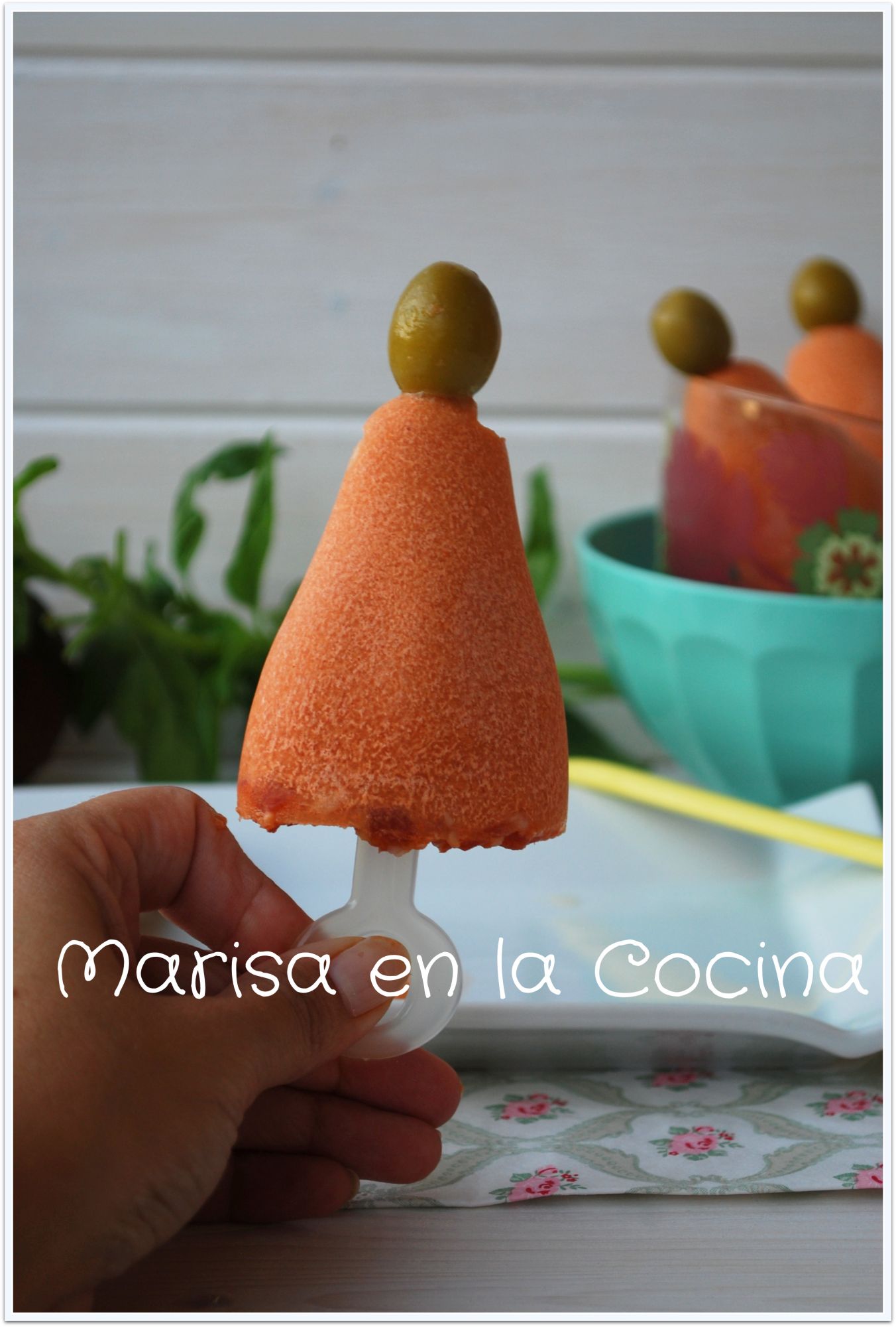 "He coronado cada polo con una aceituna rellena de jalapeño, más que nada para tapar el palito del helado. Mis moldes llevan un sistema en el que el palito se inserta en un hueco y atraviesa todo el helado saliendo por la parte superior."