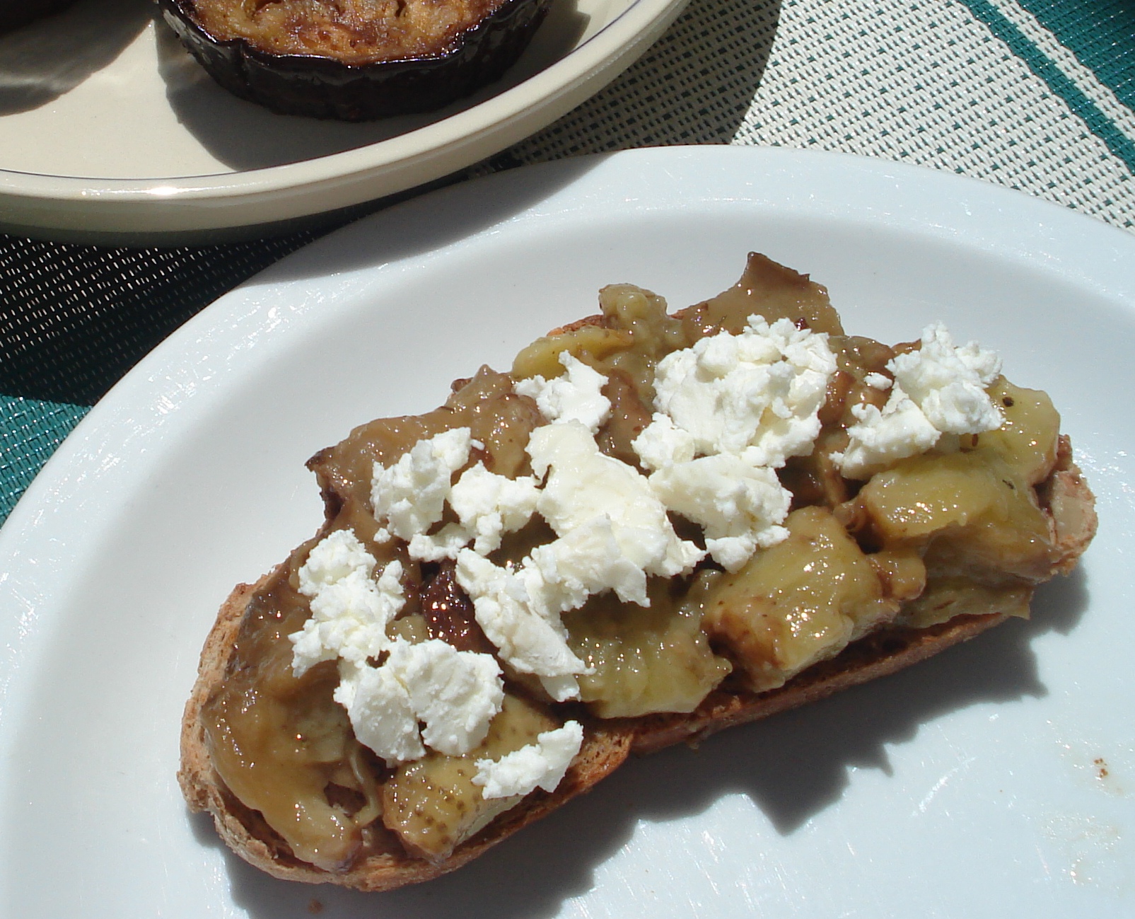 Servir con la berenjena deshecha y el queso de cabra desmenuzado por encima.