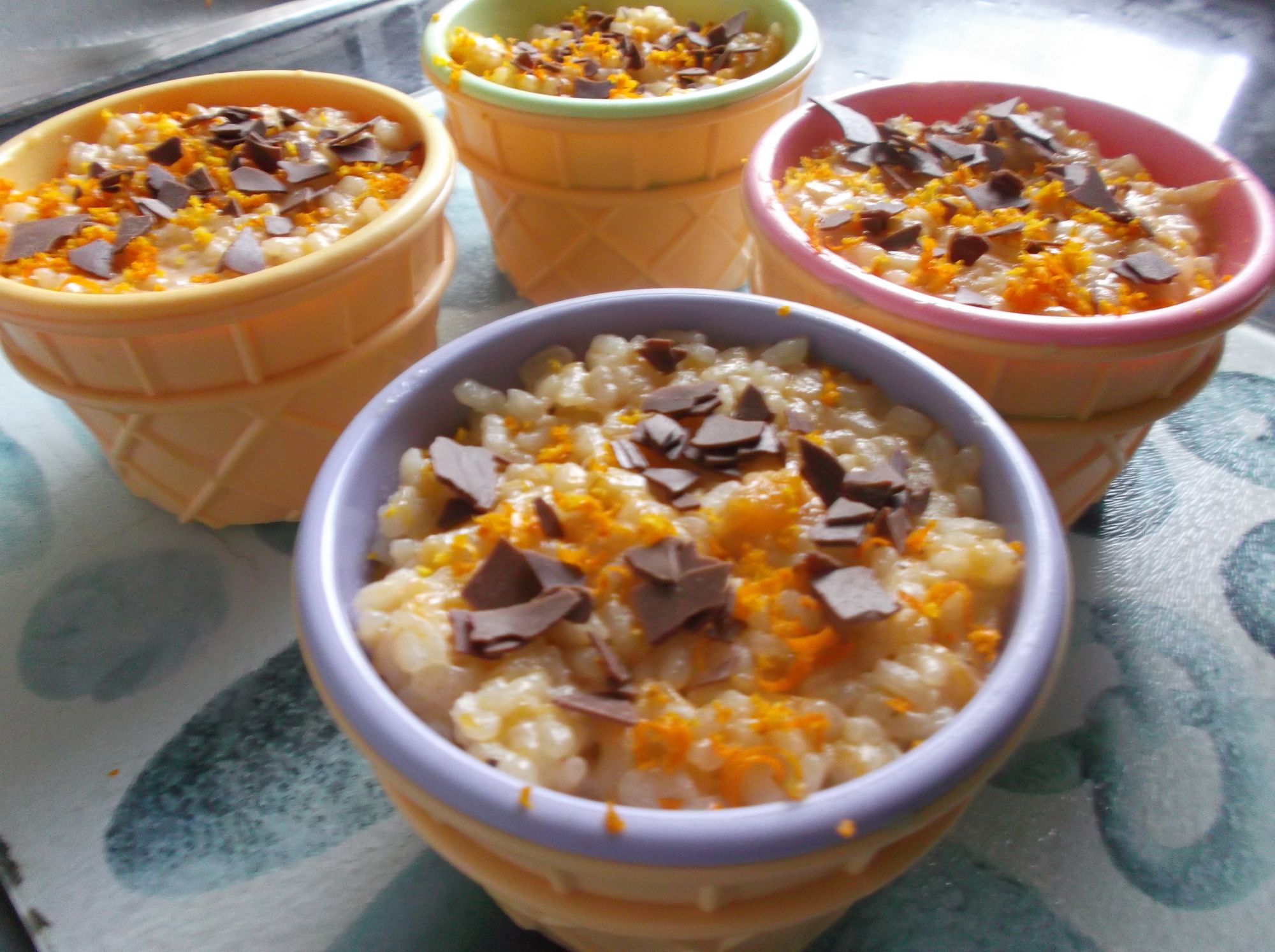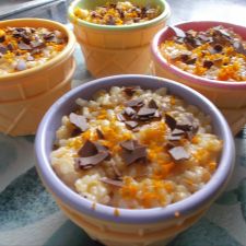 Cuando el arroz esté frio, decoramos con la piel de naranja rallada y escamas de chocolate.