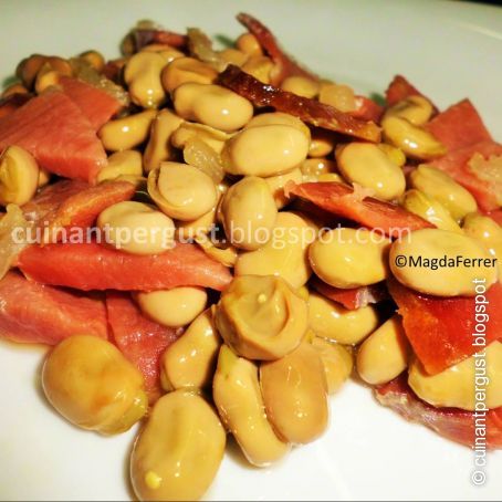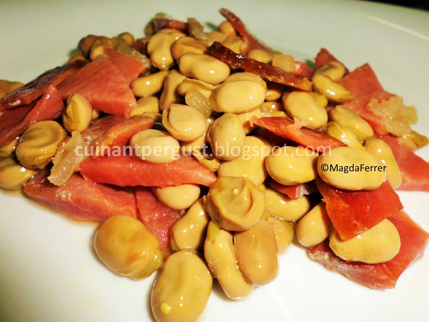 Cortar el jamón en trozos pequeños. Calentar las habas con el aceite de oliva en una sartén. En cuanto tomen la temperatura deseada agregar el jamón, remover rápidamente para que el jamón no se cueza y retirar del fuego. Escurrir el aceite y servir de inmediato.