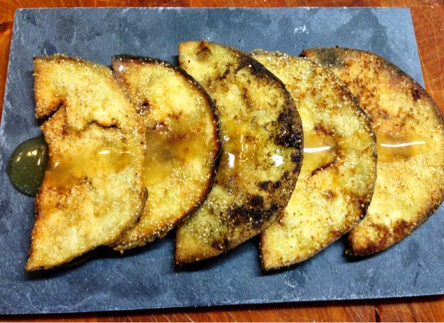 Aparte lavamos y cortamos las berengenas, las enharinamos y freimos.