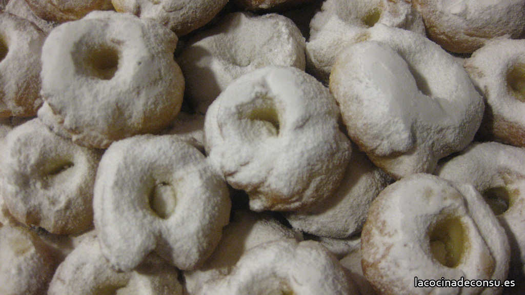 Se pone al fuego el aceite,el agua, y la leche y cuando va a empezar a hervir se echa la harina de golpe y se escalda dándole vueltas con una espátula. Se deja enfriar la masa una hora .Transcurrido la hora incorporamos los huevos batidos, y se van echando uno a uno a la masa, la movemos con una cuchara, sin parar de dar mover. Se formar los rollos ,yo cojo la masa con una cuchara y la voy poniendo sobre el papel vegetal, me unto el dedo con aceite y les voy haciendo el agujero.Se meten al horno a 180 grados unos 20 minutos.Por último se espolvorean con azúcar glass.