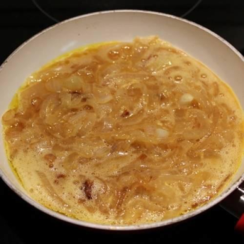 En una sartén con aceite no muy fuerte se hecha la cebolla, dándole vueltas; cuando tome algo de