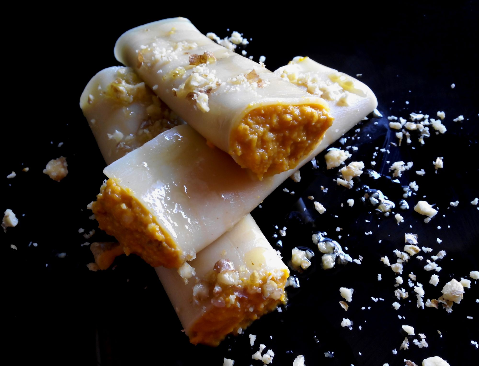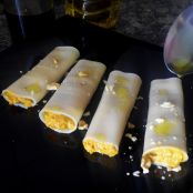 Ligar el aceite y la miel y terminar los rollitos con las nueces reservadas picadas y un hilo de salsa.