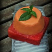 moldes para servir, corta trozos de sandía, pueden ser redondos, cuadrados, triangulares, tratando que queden lo mas regulares posible, desmolda las flaneras, y sírvelas sobra las sandías, yo serví sobre un bloque de hielo que previamente había puesto a congelar.