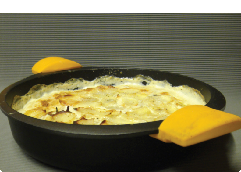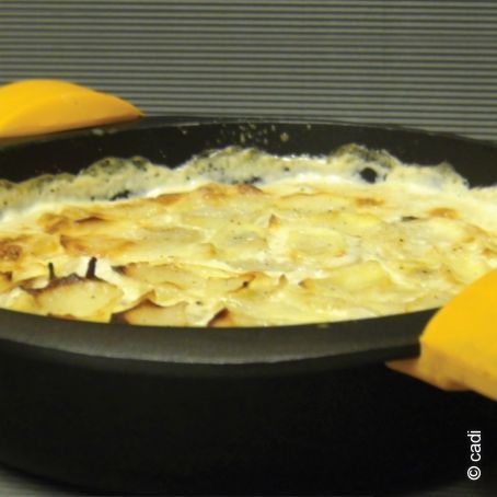 Seguidamente, en la cazuela, montaremos 2 ó 3 capas de patata, nata, queso Urgelia, setas/níscalos y tocino/panceta.