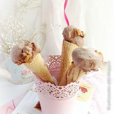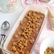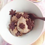 Cuando el helado esté en su punto y vayamos a tomarlo, podemos decorarlo con más galletas speculoos en trocitos, las cucharitas y flores de chocolate y un poco de dulce de leche que habremos derretido en el microondas un poco para que esté más líquido.