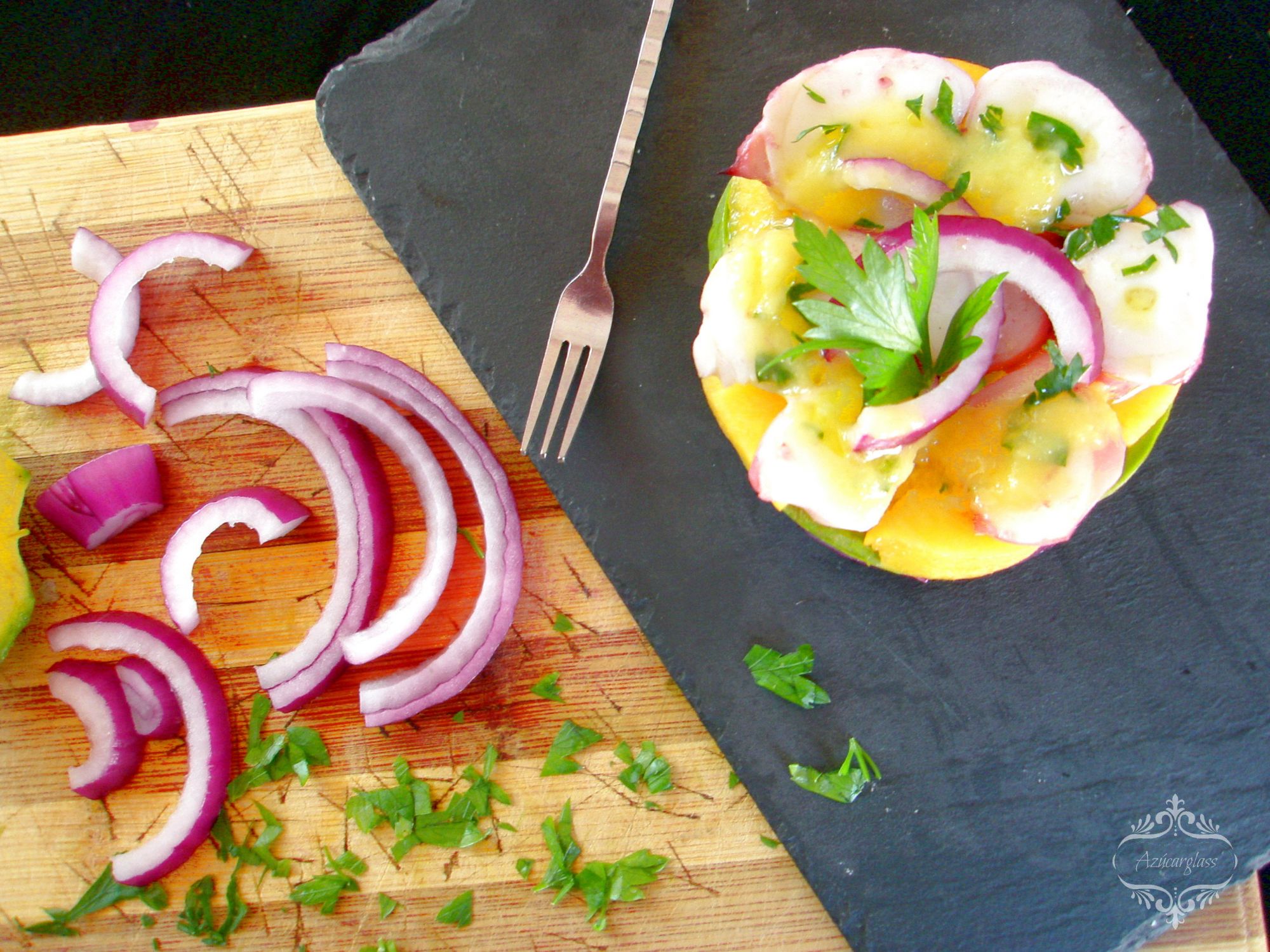 Esta es una refrescante y ligera ensalada ideal para llevar a la playa. El ingrediente principal es el pulpo cocido, acompañado con aguacate, mango (por supuesto de Málaga) y cebolla morada, todo ello aderezado con una vinagreta de mango a la que hemos añadido un toque de mostaza. La vinagreta dará un punto muy especial a nuestra ensalada. ¡Espero que os guste!