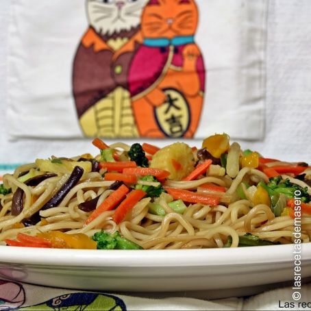 Sofreímos con un chorrito de aceite las verduras en una sartén tipo wok o normal en su defecto. Salamos y cuando ya estén listas, añadimos los fideos, mezclamos bien y como toque final le echamos un chorro de salsa de soja. La cantidad de salsa de soja va en gustos, yo la echo a ojo.
