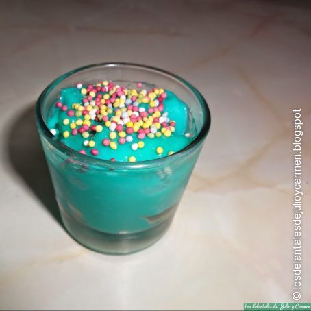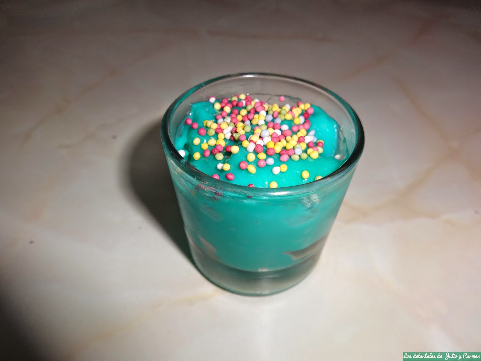 Rellenaremos los vasos de chupito con la preparación y decoraremos con bolitas de colores o fideos de chocolate.
