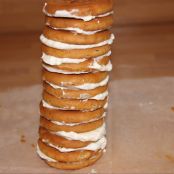 Sumergimos una galleta en leche (meter y sacar) porque en el caso de las galletas hojaldradas si las dejas más tiempo se deshacen y resulta imposible apilarlas. Untamos un poco de nata y colocamos encima otra galleta mojada en leche previamente. Repetimos este paso hasta hacer una torre como se aprecia en la fotografía, la cual colocaremos sobre papel de hornear.