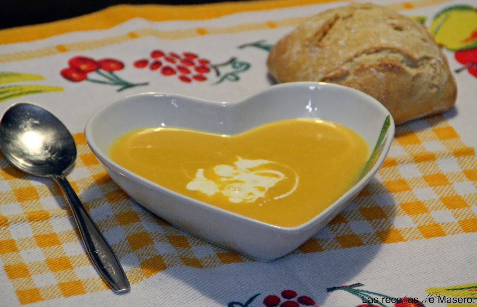 La receta de hoy se trata deuna sopa de calabaza, al menos así la llamaban en la web Whole kitchen, de la que tomé la receta. Pero para mi es más una crema, la he modificado un poco. En la receta original usan otra variedad de calabaza, yo usé la amarilla, pero salió riquísima.