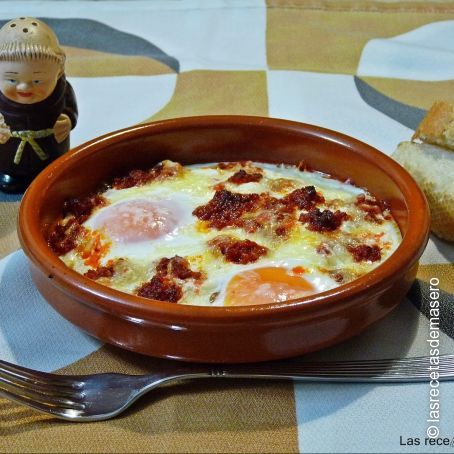 Esta receta es cosa de mi marido, la tomó en un hotel en el que estuvo alojado en unas vacaciones. Tengo entendido que se llaman huevos a la mallorquina, pero yo la llamo huevos con sobrasada. Necesitaremos una cazuela individual de barro o un cacharro similar.