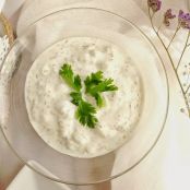 Mientras se fríen las croquetas podemos hacer la salsa. Para ello, ponemos en un bol mediano el yogur y le añadimos el pepino en cuadraditos pequeños, el ajo picado, el zumo de limón y el eneldo.